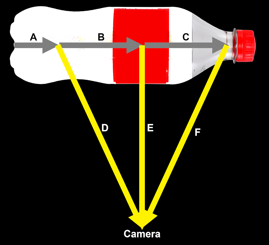 In other words, the camera does not magically report the position of the light in the bottle and create a picture of it. Cameras can only detect light that enters their lens and lands on their detector just as our eyes can only detect light that enters them. So how does the light in the bottle land on the detector?