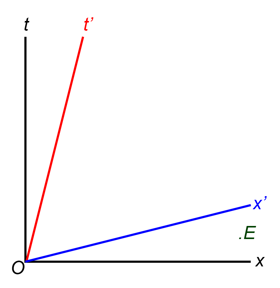 As an interesting aside, the ESC convention leads to an intriguing puzzle known as the Andromeda Paradox. When we define “now” by stipulating that the one-way speed of light is the same in all directions for any given observer (ESC), the present (“now”) of one observer will necessarily be different from the present (“now”) of another observer in relative motion. This is again represented by the different (black) x-axis and (red) x’-axis. Thus, an event E in the above diagram would be in the past according to observer B’s coordinates (it is below his x’-axis), but would be in the future according to observer A’s coordinates (it is above his x-axis). This effect is very small for the kinds of speeds and distances we normally experience on earth, but becomes very large at cosmic distances.